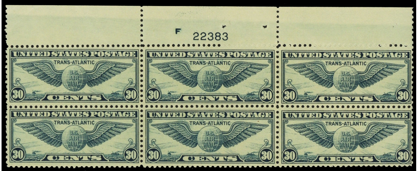 C24, Mint NH 30¢ Top Plate Block of Six CV $110 - Stuart Katz