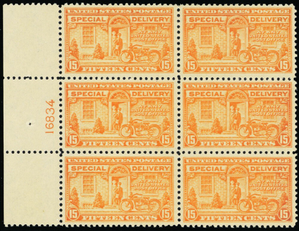 E13, Mint VF/XF VLH 15¢ Plate Block of Six Cat $450.00 - Stuart Katz