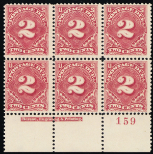 J39, Mint NH RARE 2¢ Plate Block of Six SCV $450 * Stuart Katz