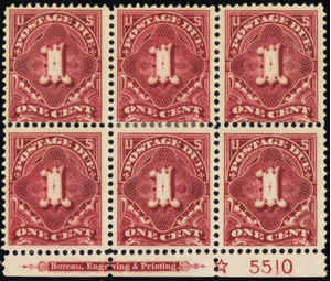 J45, Mint H/NH RARE 1¢ Plate Block of Six SCV $575 * Stuart Katz