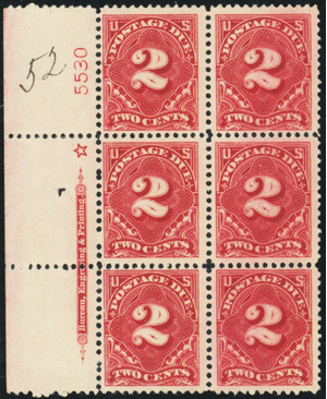 J46, Mint VF OG 2¢ Scarce Block of Six Stamps CV $550.00 - Stuart Katz