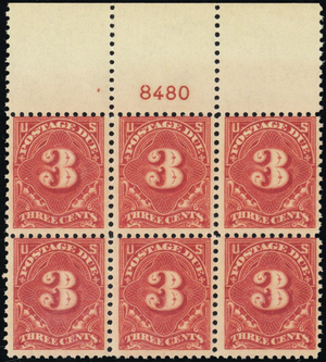 J63, Mint NH 3¢ Top Plate Block of Six SCV $275 * Stuart Katz