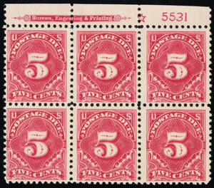 J64, Mint NH (5) 1 (H) 5¢ Top Plate Block of Six SCV $173 * Stuart Katz
