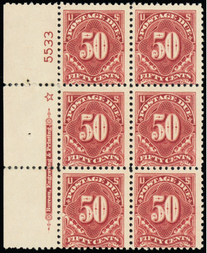 J67, Mint NH VERY RARE 50¢ Plate Block of Six SCV $2400.00 * Stuart Katz