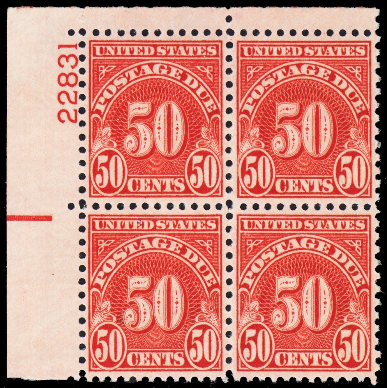 J86, Mint VF LH 50¢ Plate Block of 4 Postage Due Stamps - Stuart Katz