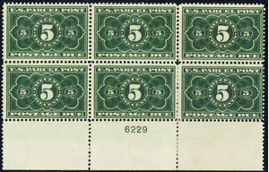 JQ3, Mint F-VF LH 5¢ Plate Block of Six SCV $450.00 * Stuart Katz