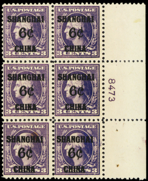 K3, Mint NH Fine+ 6¢ Shanghai Scarce Plate Block of Six CV $1150 - Stuart Katz