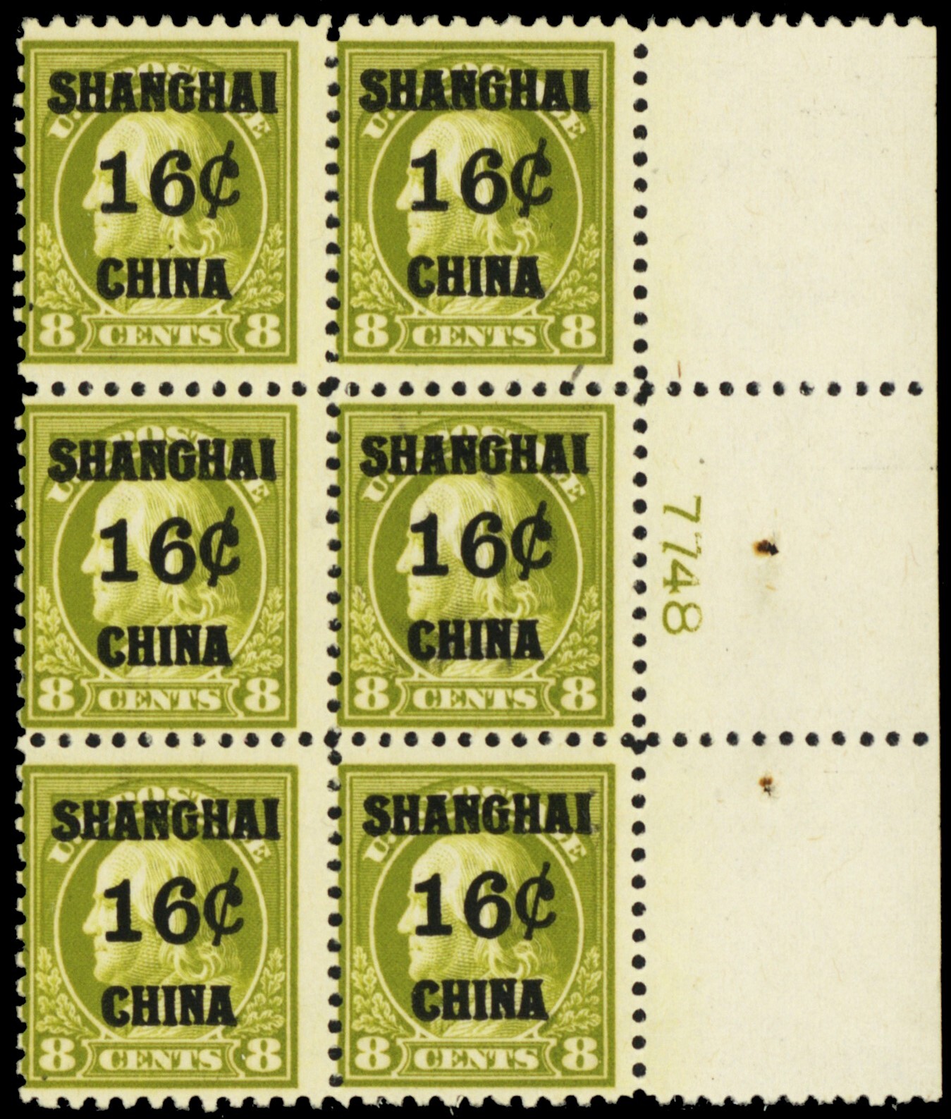 K8, Mint NH 16¢ Shanghai Scarce Plate Block of Six - Stuart Katz