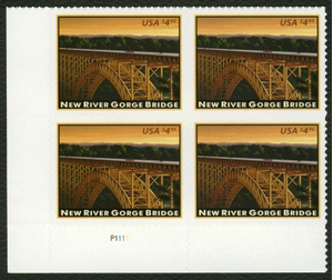 New River Gorge Bridge $4.95 Priority Mail Plate Block of Four Stamps Scott 4511