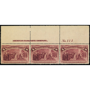 236, Mint VF NH 8¢ PL# & Imprint Strip of 3 - PFC Certificate - Stuart Katz