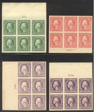 Scott #481-84 (no #482A): 1c - 3c Imperfs Centering & Condition: Mint. Fresh. Very Fine set of Plate Blocks. Reverse (Gum Side): Original gum. Never Hinged. Faults / Imperfections: None The item pictured is the actual item you are purchasing, unless otherwise noted. I also offer an interest-free layaway plan. Ask me about it!" All items will be mailed a day or two after payment is received. --------------------------------------------------------------------------------