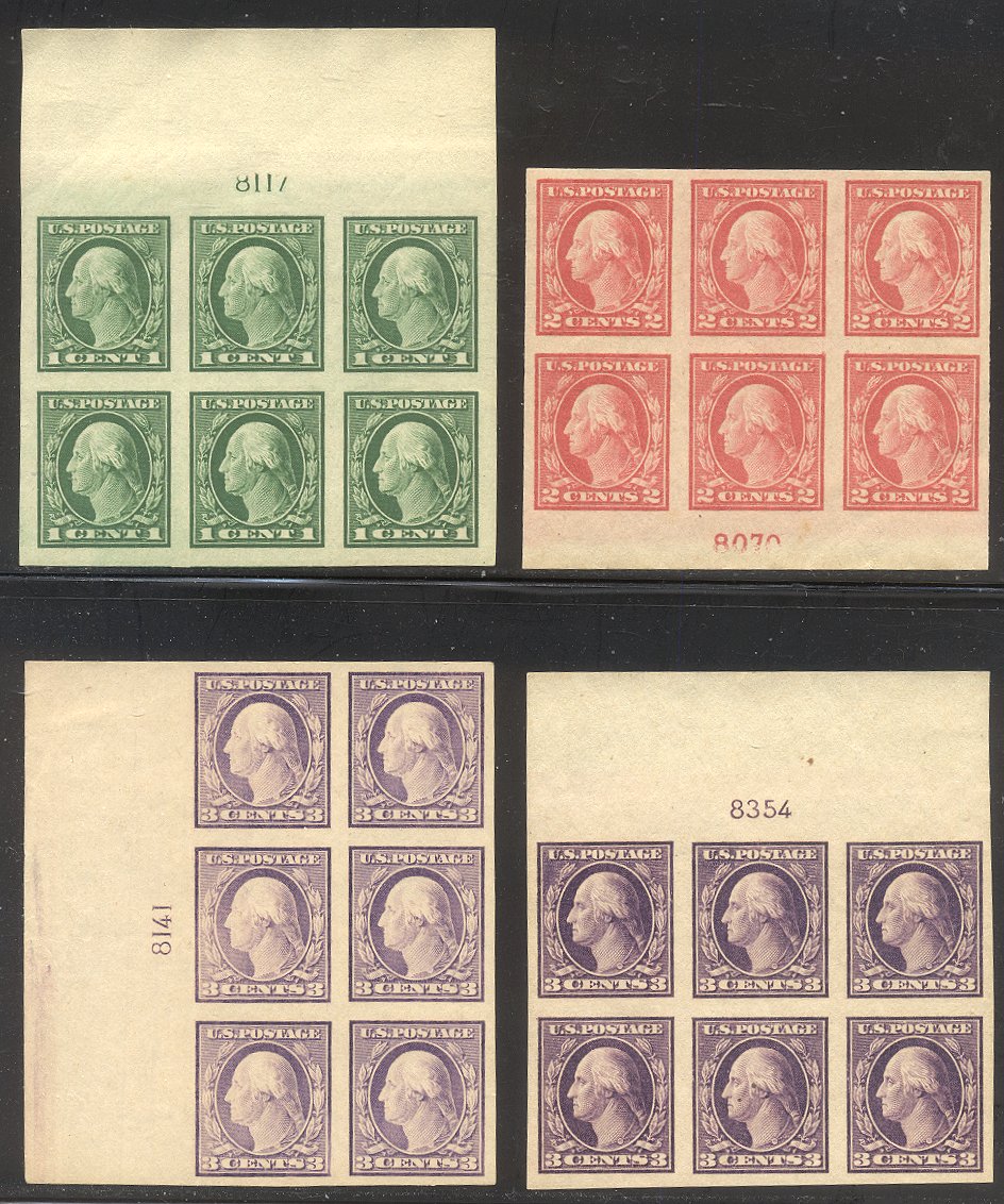 Scott #481-84 (no #482A): 1c - 3c Imperfs Centering & Condition: Mint. Fresh. Very Fine set of Plate Blocks. Reverse (Gum Side): Original gum. Never Hinged. Faults / Imperfections: None The item pictured is the actual item you are purchasing, unless otherwise noted. I also offer an interest-free layaway plan. Ask me about it!" All items will be mailed a day or two after payment is received. ![]() ![]() ![]() --------------------------------------------------------------------------------
