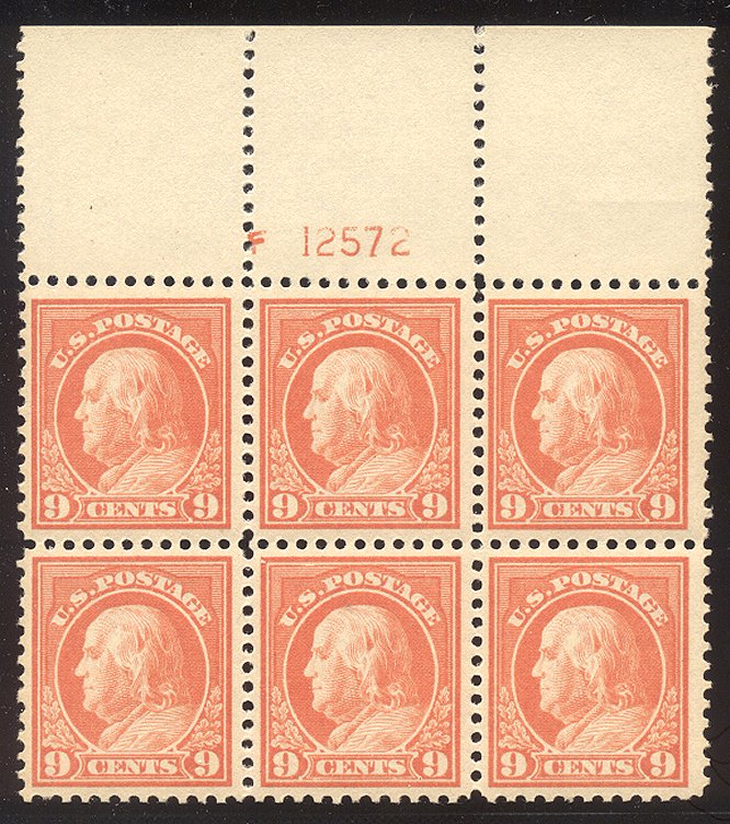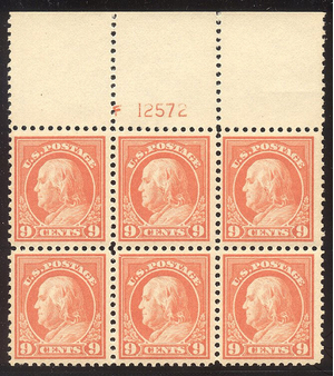 Scott #509: 1917 9c Salmon, P11 Centering & Condition: Mint. Fresh. Very Fine and CHOICE Plate Block. Reverse (Gum Side): Original gum. Never Hinged. Faults / Imperfections: None The item pictured is the actual item you are purchasing, unless otherwise noted. I also offer an interest-free layaway plan. Ask me about it!" All items will be mailed a day or two after payment is received. ![]() ![]() ![]() --------------------------------------------------------------------------------