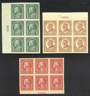 Scott #575-77: 1923 Portraits, Imperf Centering & Condition: Mint. Fresh. Very Fine Plate Block set. Reverse (Gum Side): Original gum. Never Hinged. Faults / Imperfections: None The item pictured is the actual item you are purchasing, unless otherwise noted. I also offer an interest-free layaway plan. Ask me about it!" All items will be mailed a day or two after payment is received. --------------------------------------------------------------------------------