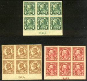 Scott #575-77: 1c - 2c Imperfs Centering & Condition: Mint. Fresh. Very Fine set of Plate Blocks. Reverse (Gum Side): Original gum. Never Hinged. Faults / Imperfections: None The item pictured is the actual item you are purchasing, unless otherwise noted. I also offer an interest-free layaway plan. Ask me about it!" All items will be mailed a day or two after payment is received. --------------------------------------------------------------------------------
