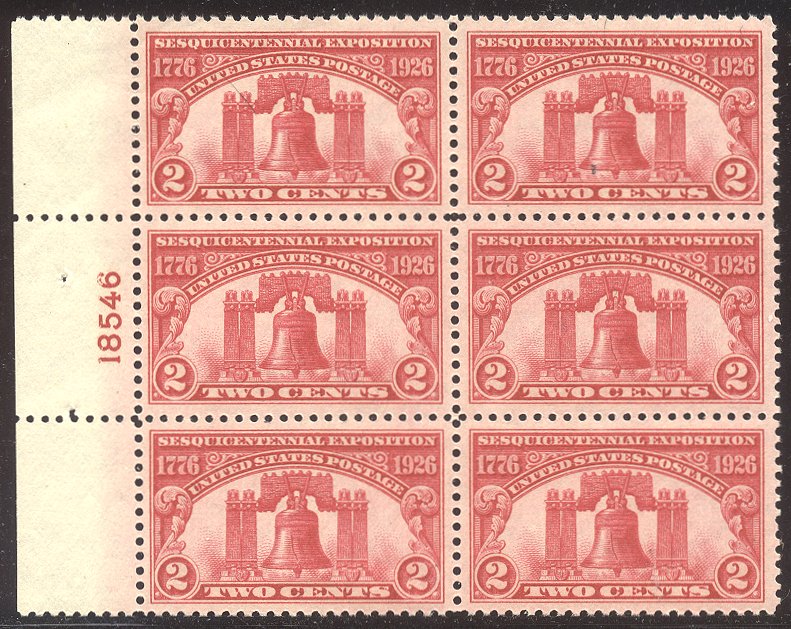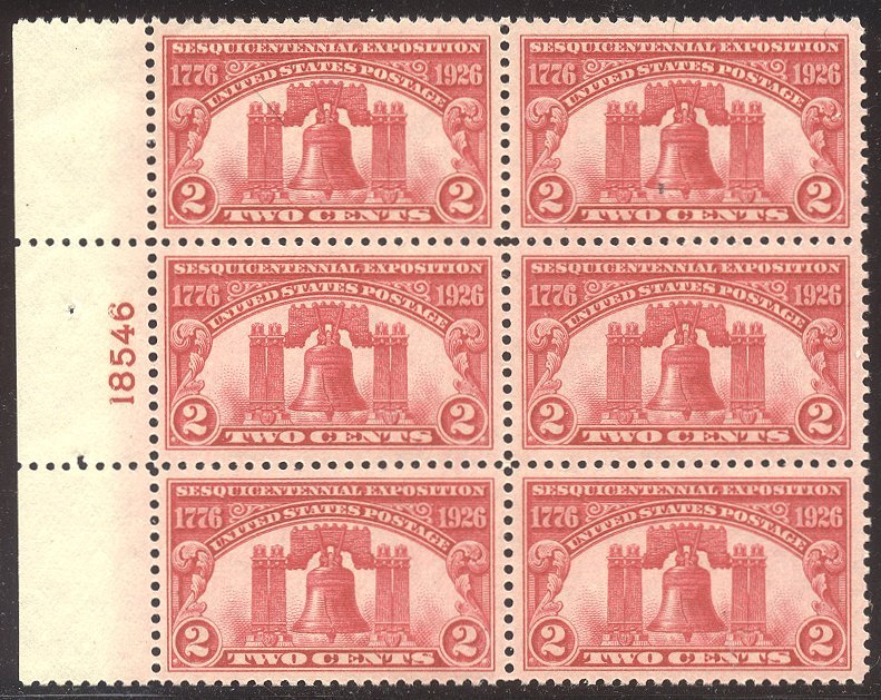 Scott #627: 1926 2c Liberty Bell Centering & Condition: Mint. Fresh. XF/SUP and CHOICE Plate Block. Reverse (Gum Side): Original gum. Never Hinged. Faults / Imperfections: None The item pictured is the actual item you are purchasing, unless otherwise noted. I also offer an interest-free layaway plan. Ask me about it!" All items will be mailed a day or two after payment is received. ![]() ![]() ![]() ![]() ![]() -------------------------------------------------------------------------------- Please click any of the following to read: |
