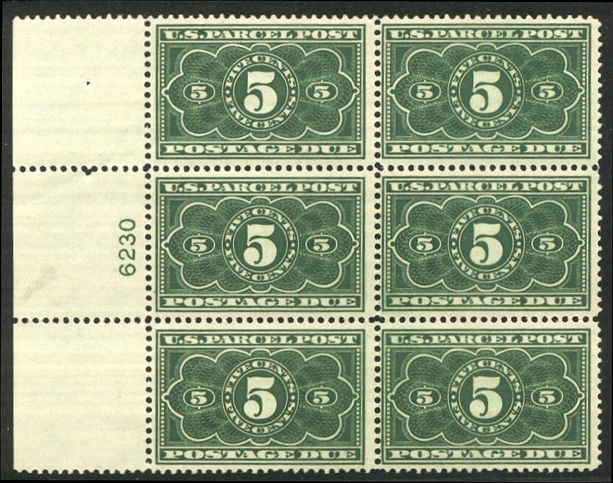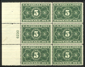 Scott #JQ3: 5c Parcel Post Postage Due Centering & Condition: Mint. Fresh. Fine-Very Fine and CHOICE Plate Block. Reverse (Gum Side): Original Gum. Never Hinged. Faults / Imperfections: None The item pictured is the actual item you are purchasing, unless otherwise noted. I also offer an interest-free layaway plan. Ask me about it!" All items will be mailed a day or two after payment is received. ![]() ![]() ![]() ![]() -------------------------------------------------------------------------------- Please click any of the following to read: |