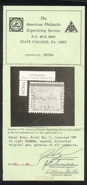 Scott #1 var: 1904 2c Rose, Inverted "N" Centering & Condition: Mint. Fresh. Fine-Very Fine example showing the "N" in the right "PANAMA" inverted. An APEX Certificate accompanies. Also signed on the back by Elliott Perry. Reverse (Gum Side): Original gum. Faintly Hinged. Faults / Imperfections: None The item pictured is the actual item you are purchasing, unless otherwise noted. I also offer an interest-free layaway plan. Ask me about it!" All items purchased will be mailed a day or two after payment is received. --------------------------------------------------------------------------------