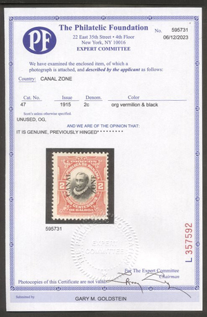 Scott #47: 1920 2c Org Vermilion & Black Centering & Condition: Mint. Fresh. Fine example of this RARE stamp. A Foundation certificate accompanies. I believe this is the RAREST regularly issued Canal Zone stamp. Reverse (Gum Side): Original gum. Hinged with a small remnant. Faults / Imperfections: Cert calls out "small stains" but these are truly irrelevant The item pictured is the actual item you are purchasing, unless otherwise noted. I also offer an interest-free layaway plan. Ask me about it!" All items purchased will be mailed a day or two after payment is received. --------------------------------------------------------------------------------