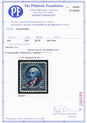 No refunds will be made after 60 days after the sale date unless extra time is granted. Due to the high cost of obtaining certificates we will only refund the cost of the stamp and not the cost of the certificate. For U.S. stamps only certificates from either APS, PSE or from the Philatelic Foundation are accepted, however "graded" certificates or "encased" items are not accepted.