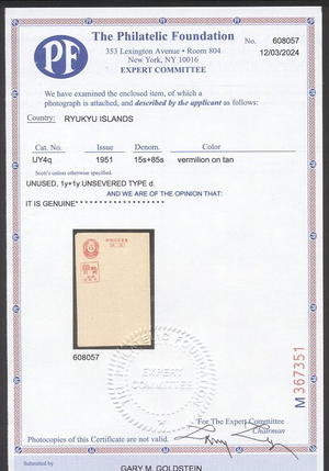 Scott #UY4q: 1951 1y + 1y Msg-Reply Card, Type "d" Centering & Condition: Mint. Fresh. Very Fine and SCARCE Message-Reply card. Reverse (Gum Side): N/A Faults / Imperfections: None The item pictured is the actual item you are purchasing, unless otherwise noted. I also offer an interest-free layaway plan. Ask me about it!" All items will be mailed a day or two after payment is received. --------------------------------------------------------------------------------