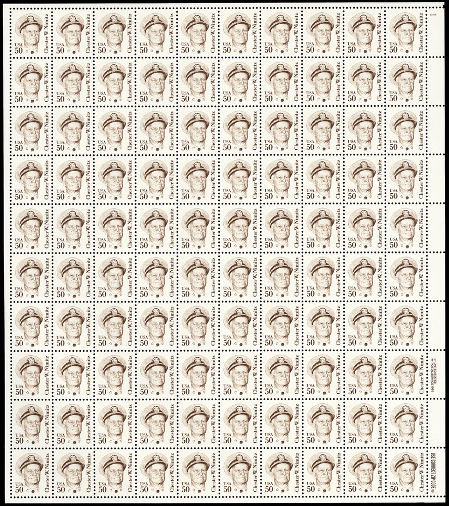 1869a, Nimitz Complete Sheet of 100 50 Cent Stamps CV $600. - Stuart Katz