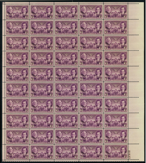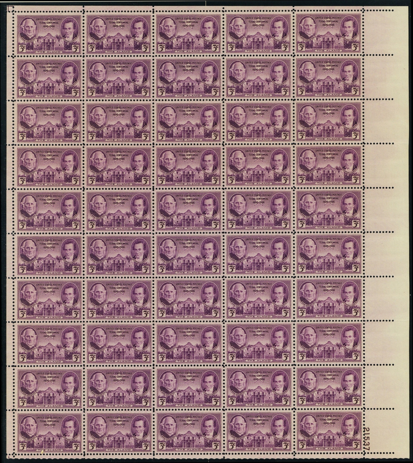 1936 Three Cent Texas Centennial Sheet of Fifty 3 Cent Postage Stamps Scott 776