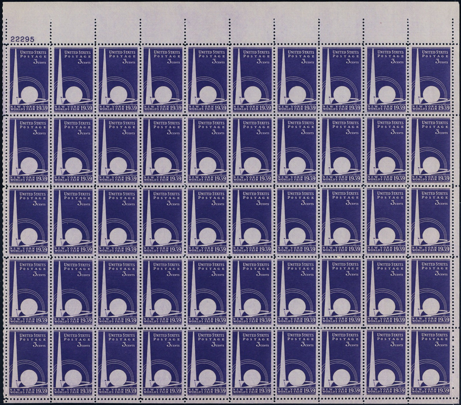 1939 Trylon and Perisphere Sheet of Fifty 3 Cent Postage Stamps Scott 853