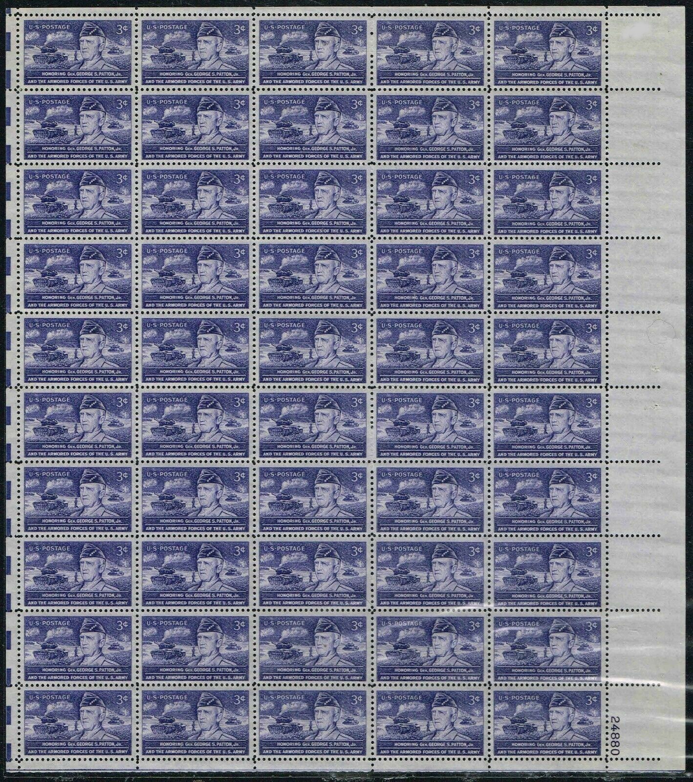 1953 General George S. Patton Sheet of Fifty 3 Cent Postage Stamps Scott 1026