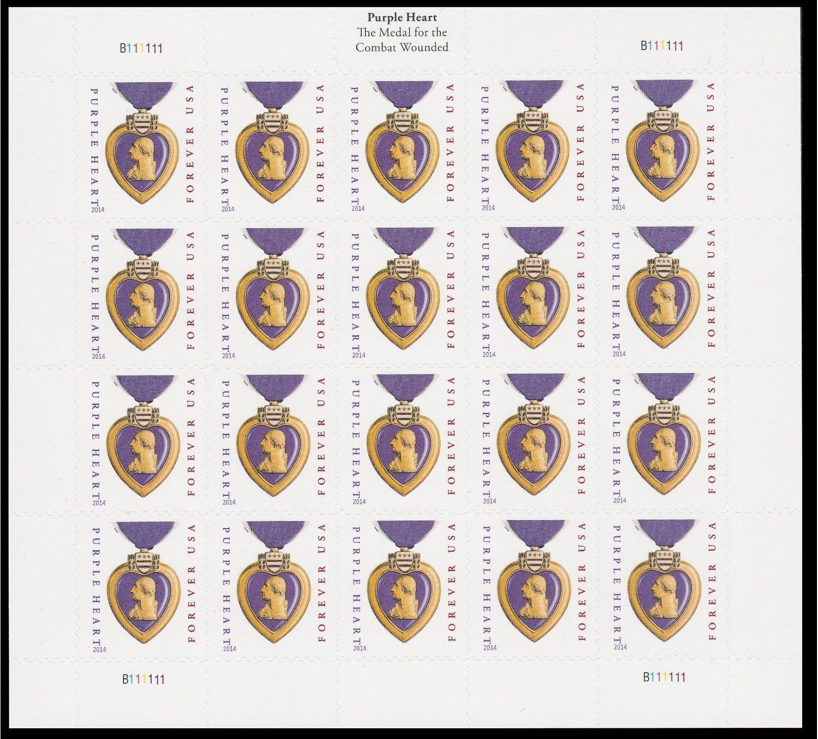 2014 Purple Heart Medal Sheet of 20 Current Rate Postage Stamps Scott 5035