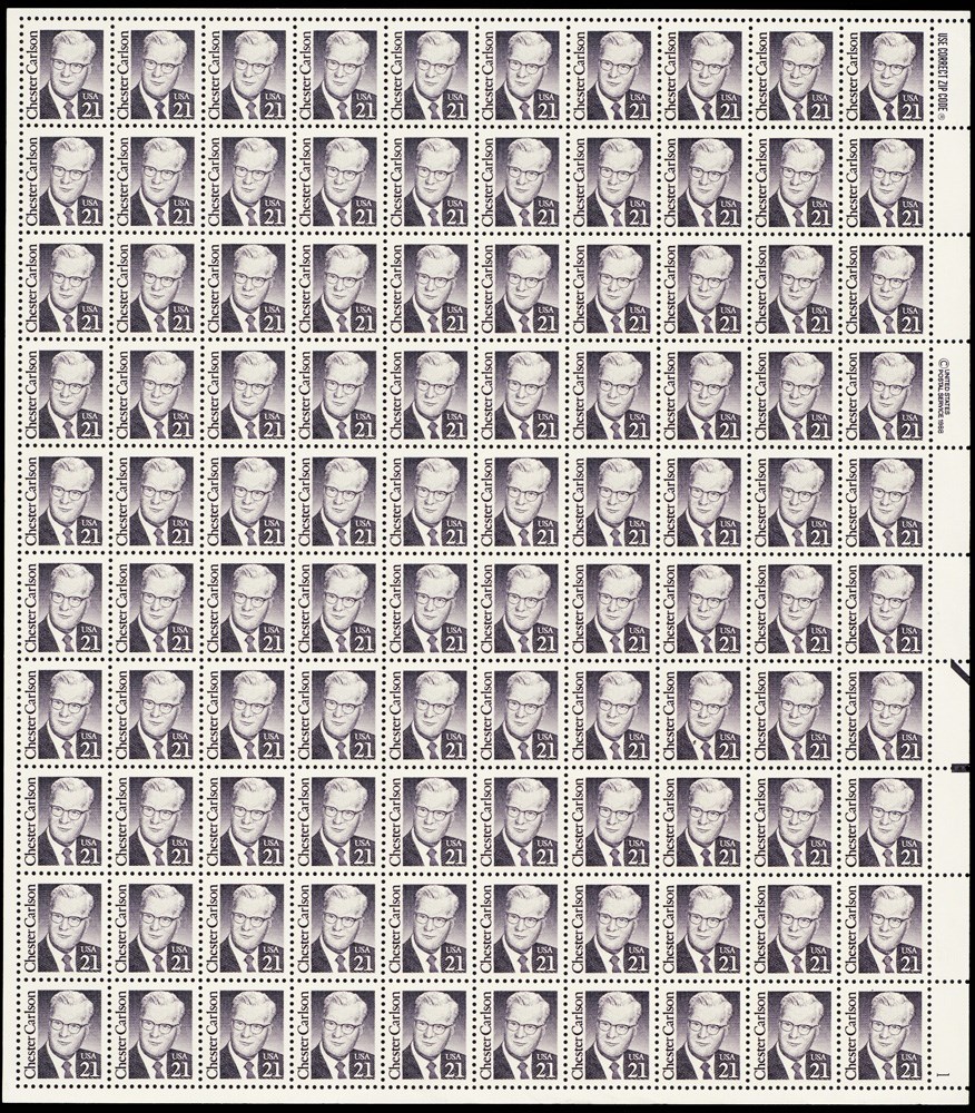 2180, 21¢ Chester Carlson Complete Pane of 100 Stamps CV $67.50 - Stuart Katz