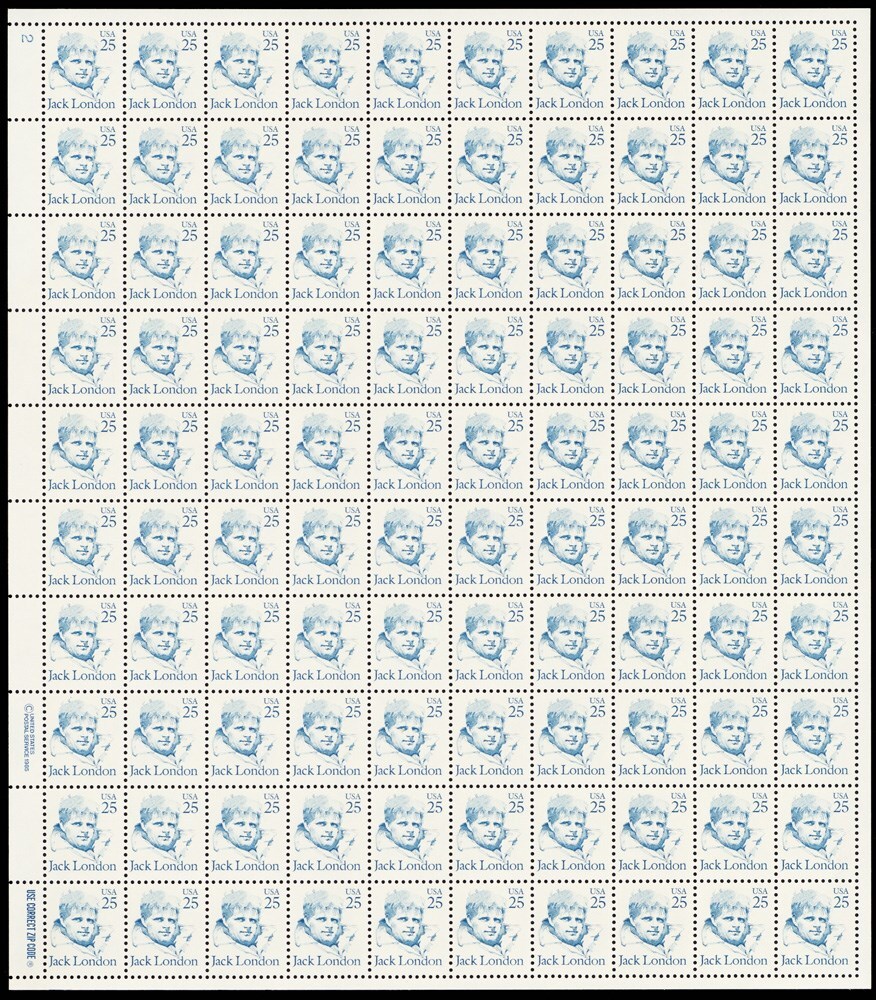 2182, 25¢ Jack London Complete Pane of 100 Stamps CV $72.50 - Stuart Katz