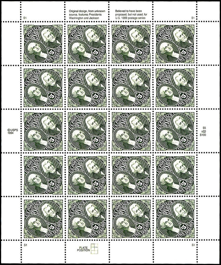 2592, $5 Washington Jackson Sheet of 20 Stamps VF NH - Stuart Katz