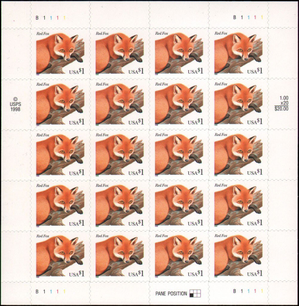 3036 $1 Red Fox Mint Complete Sheet of 20 Stamps - Scarce! - Stuart Katz