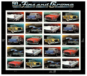 50's Car Fins and Chrome Sheet of Twenty 42 Cent Postage Stamps Scott 4353-57