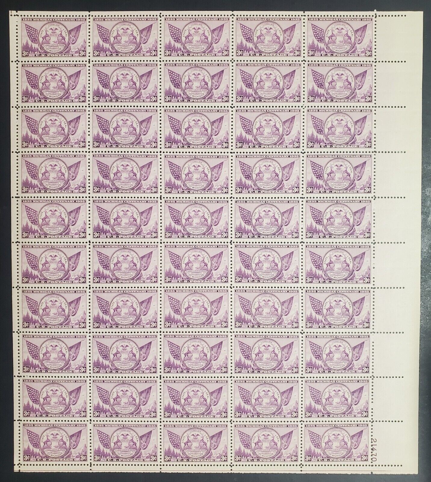 775, MNH 3¢ Michigan Centenary Sheet of 50 Postage Stamps * Stuart Katz