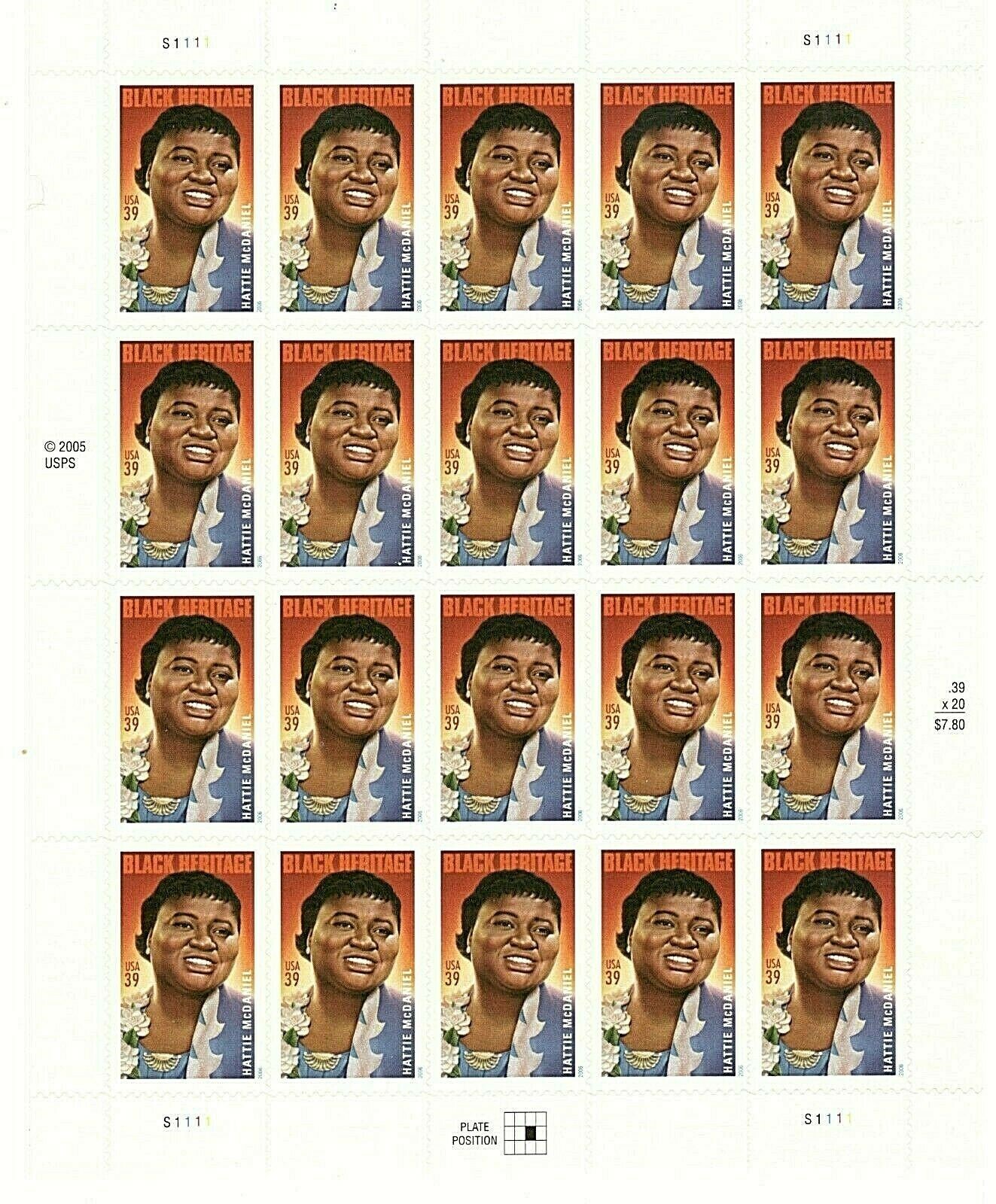 Actress Hattie McDaniel Black Heritage Sheet of Twenty 39 Cent Stamps Scott 3996