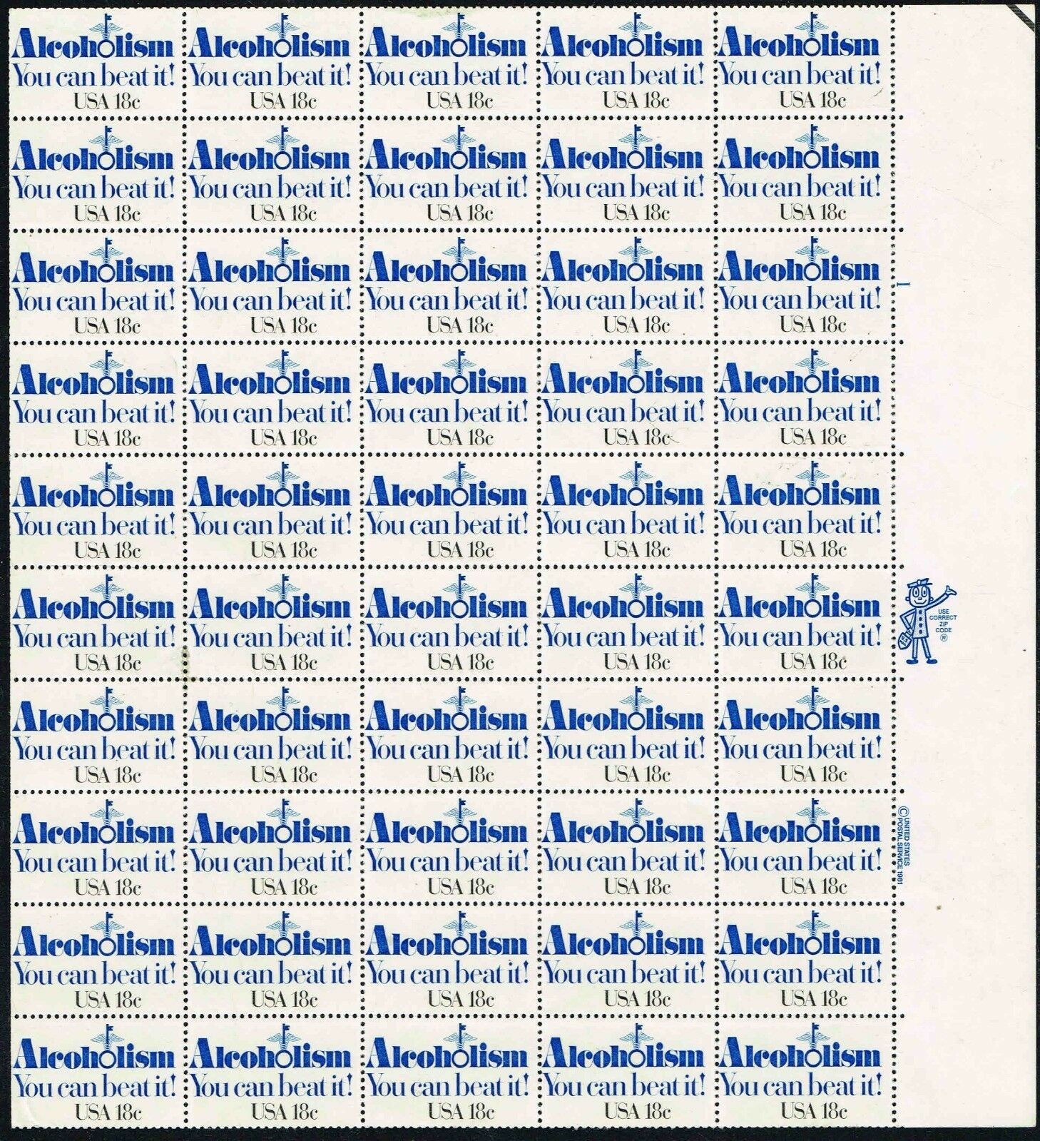 Alcoholism "You Can Beat It!" Sheet of Fifty 18 Cent Postage Stamps Scott 1927