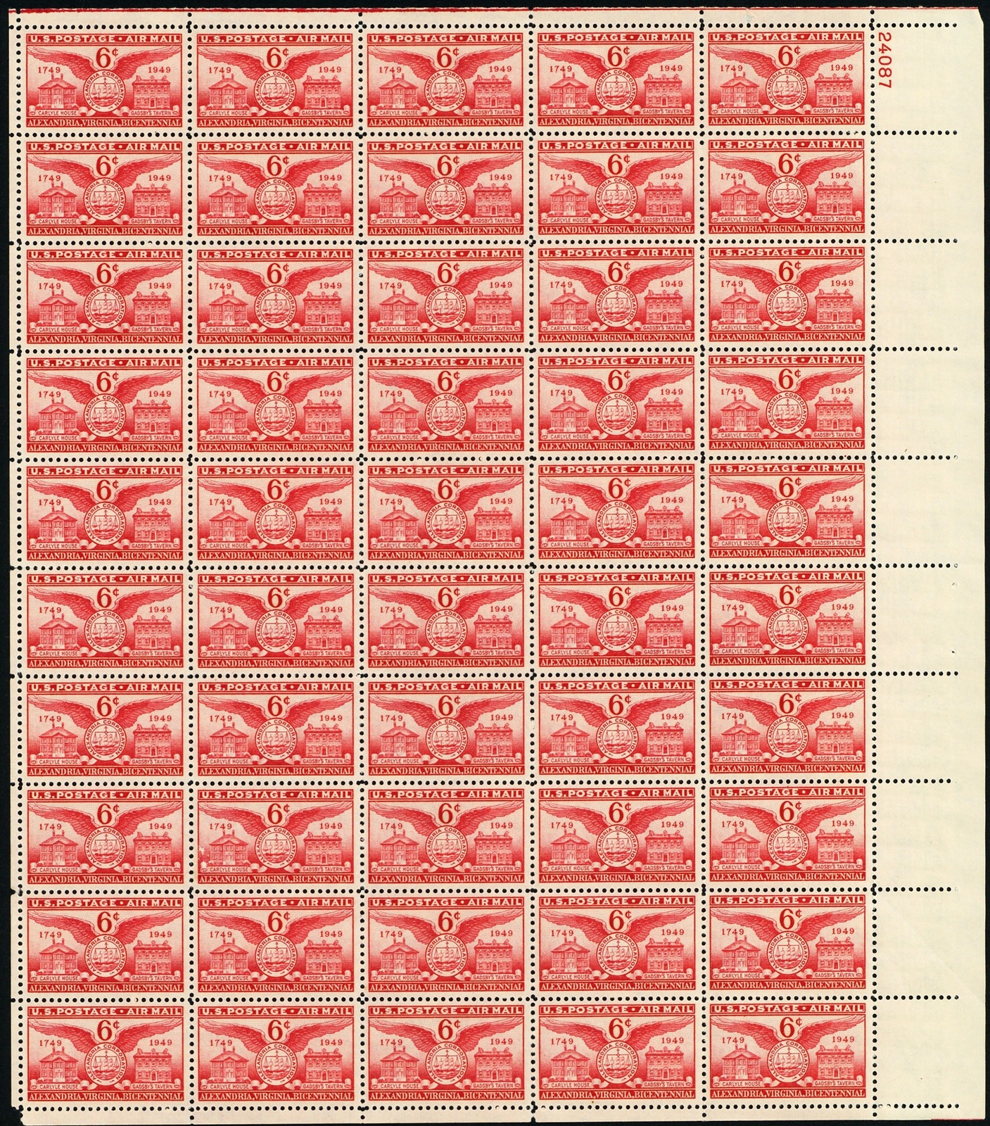 Alexandria Virginia Full Sheet of Fifty 6 Cent Airmail Postage Stamps Scott C40