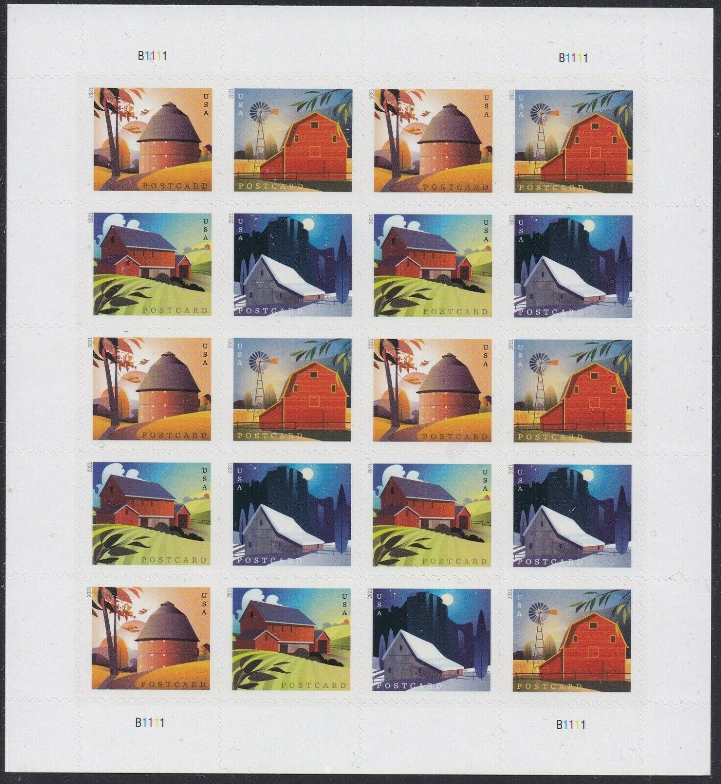 American Barns Pane of 20 Postcard Rate Stamps Scott 5546-49