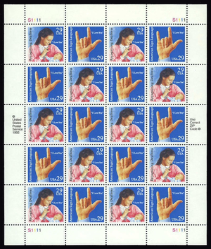 American Sign Language Sheet of Twenty 29 Cent Postage Stamps Scott 2783-84