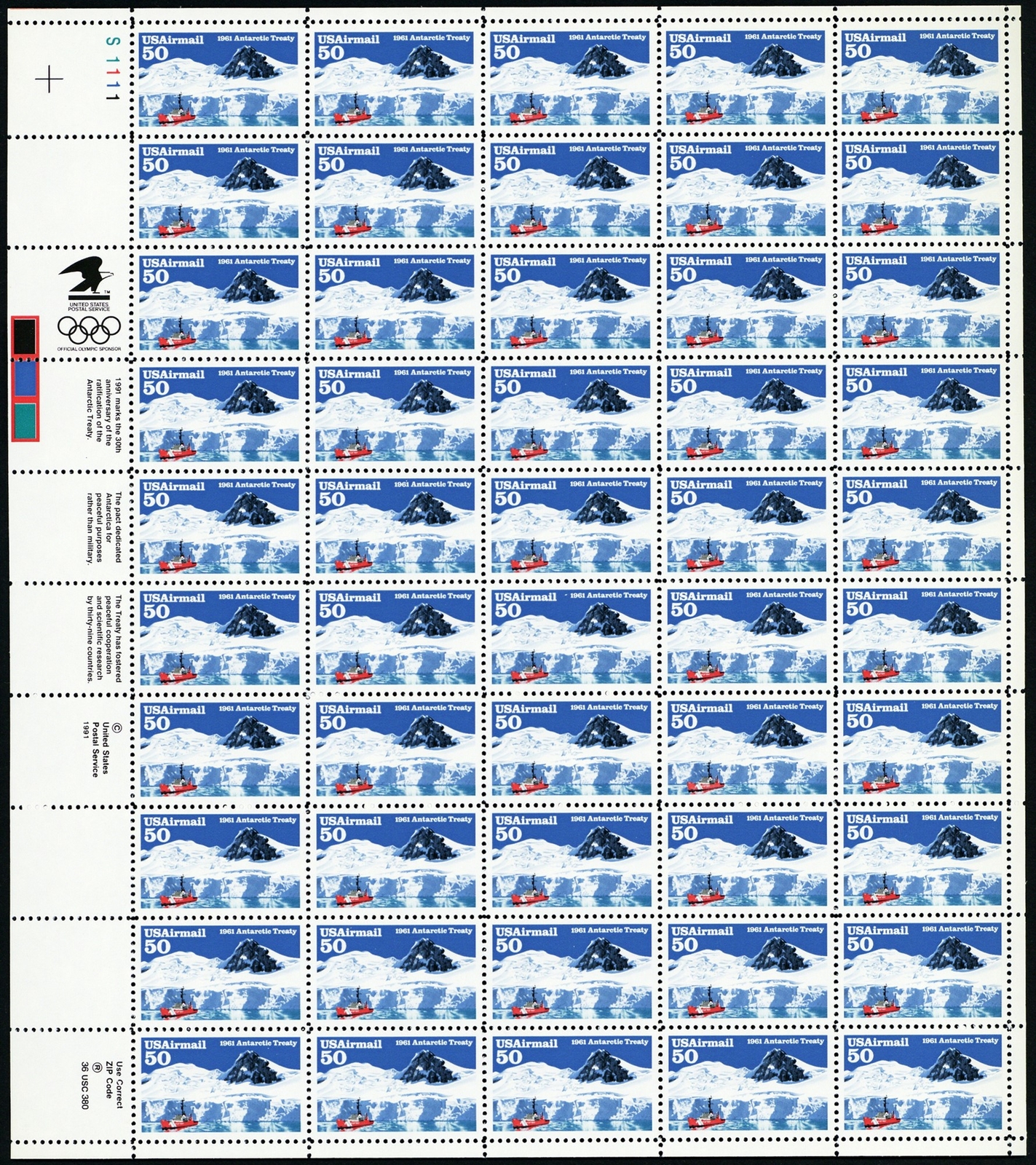 Antarctic Treaty Full Sheet of Fifty 50 Cent Airmail Postage Stamps Scott C130