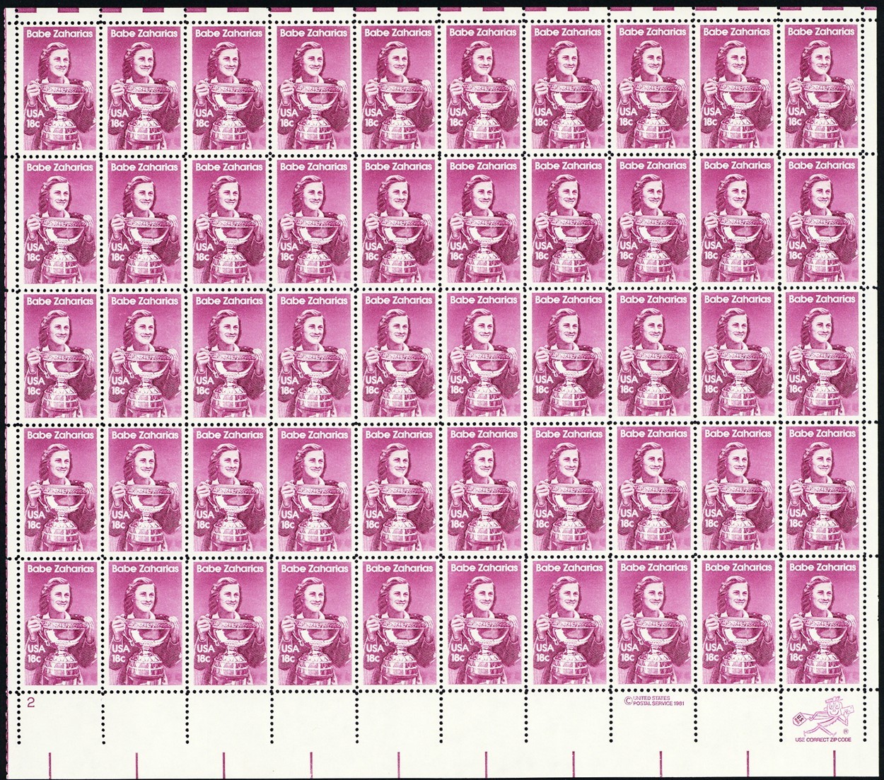 Babe Zaharias Athlete Complete Sheet of Fifty 18 Cent Postage Stamps Scott 1932