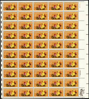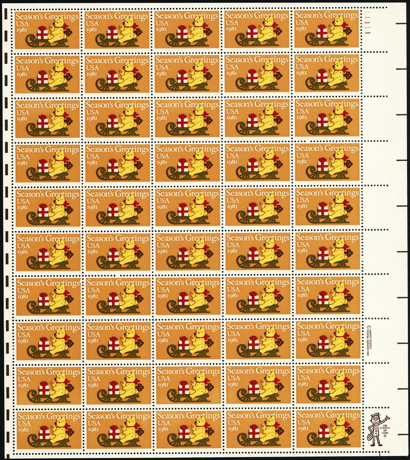 Bear on Sleigh Christmas Sheet of Fifty 20 Cent Postage Stamps Scott 1940
