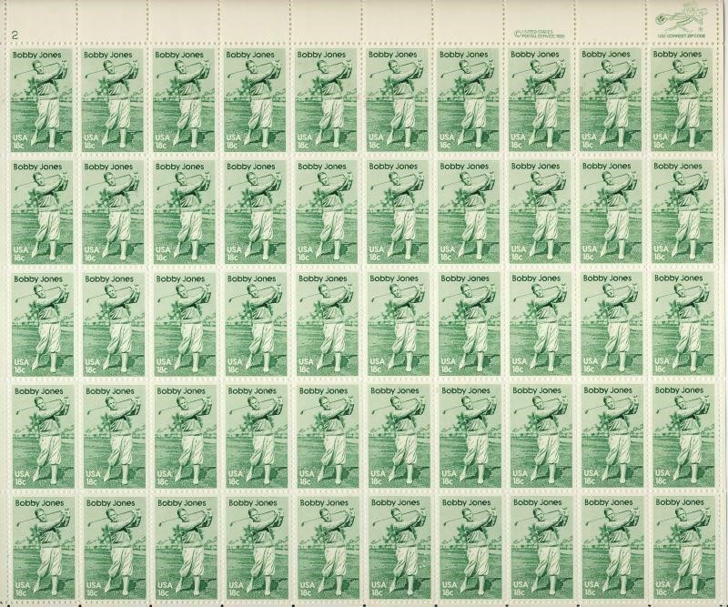 Bobby Jones Golfer Sheet of Fifty 18 Cent Postage Stamps Scott 1933