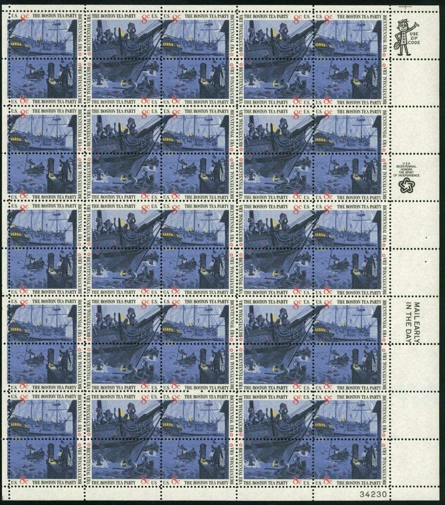 Boston Tea Party Complete Sheet of Fifty 8 Cent Postage Stamps Scott 1480-83
