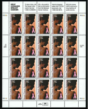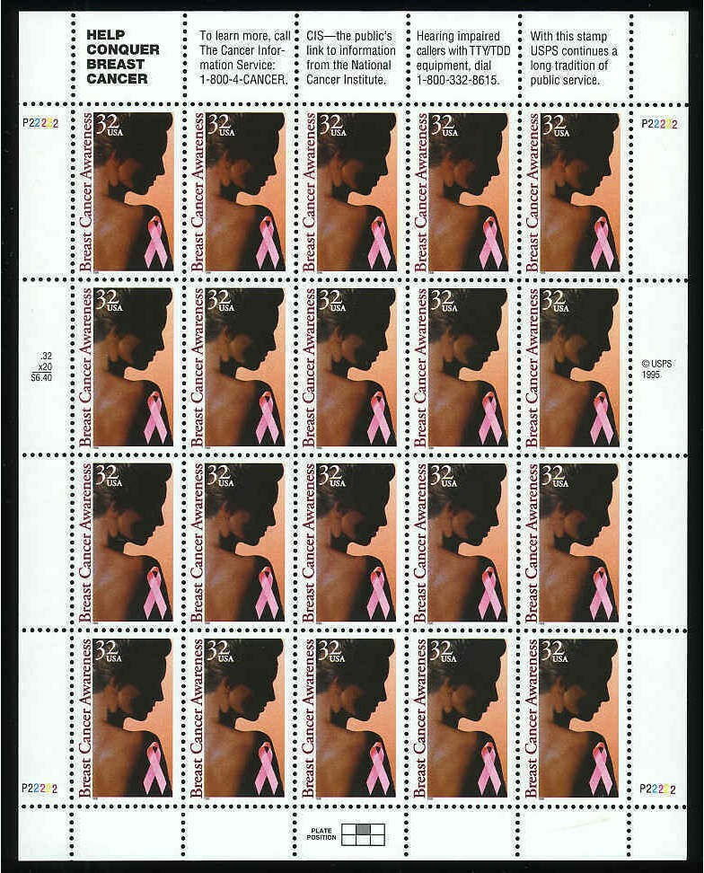 Breast Cancer Awareness 32 Cent Full Sheet of Twenty Postage Stamps Scott 3081