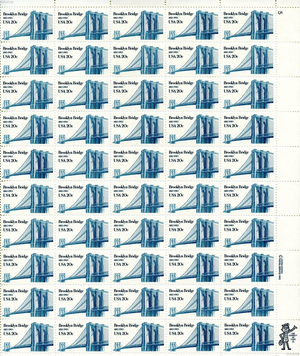 Brooklyn Bridge Sheet of Fifty 20 Cent Postage Stamps Scott 2041