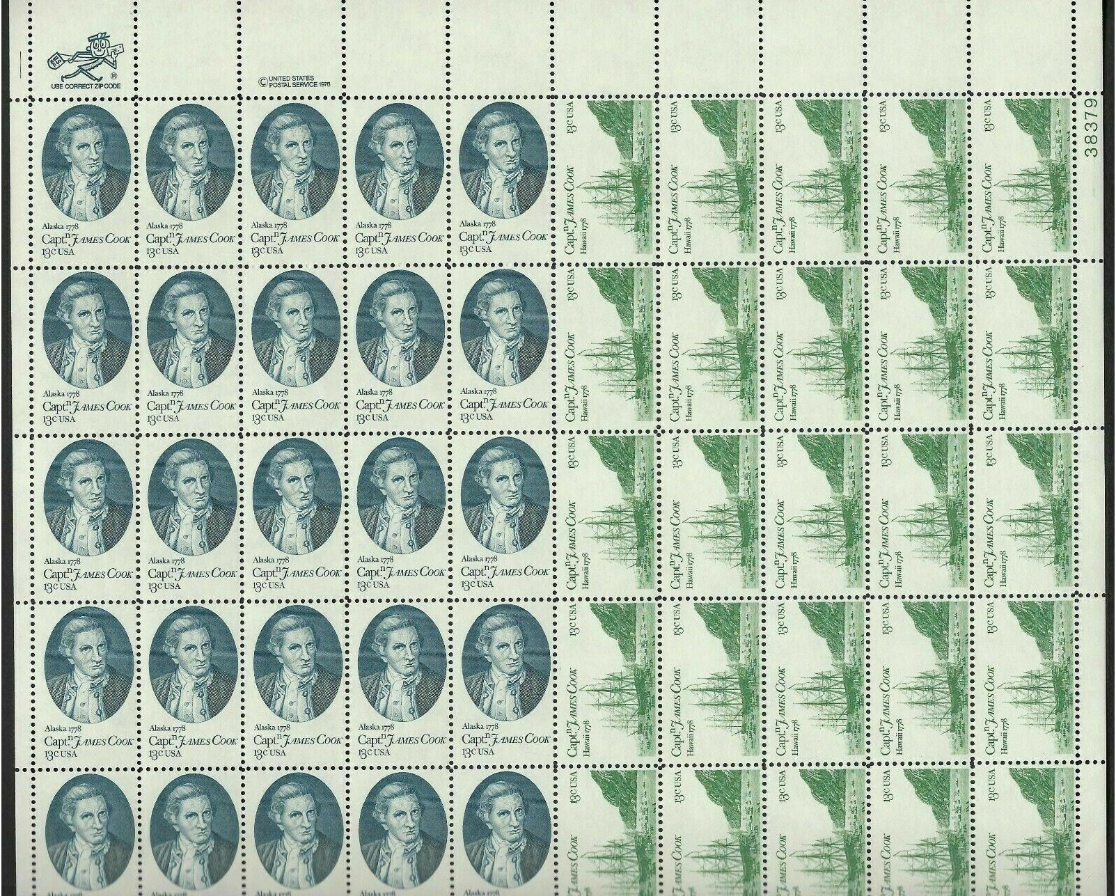 Captain Cook Sheet of Fifty 13 Cent Postage Stamps Scott 1732-33