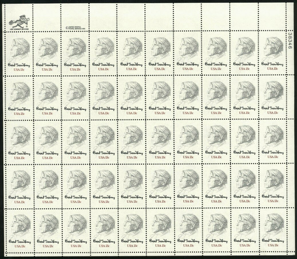 Carl Sandburg Sheet of Fifty 13 Cent Postage Stamps Scott 1731